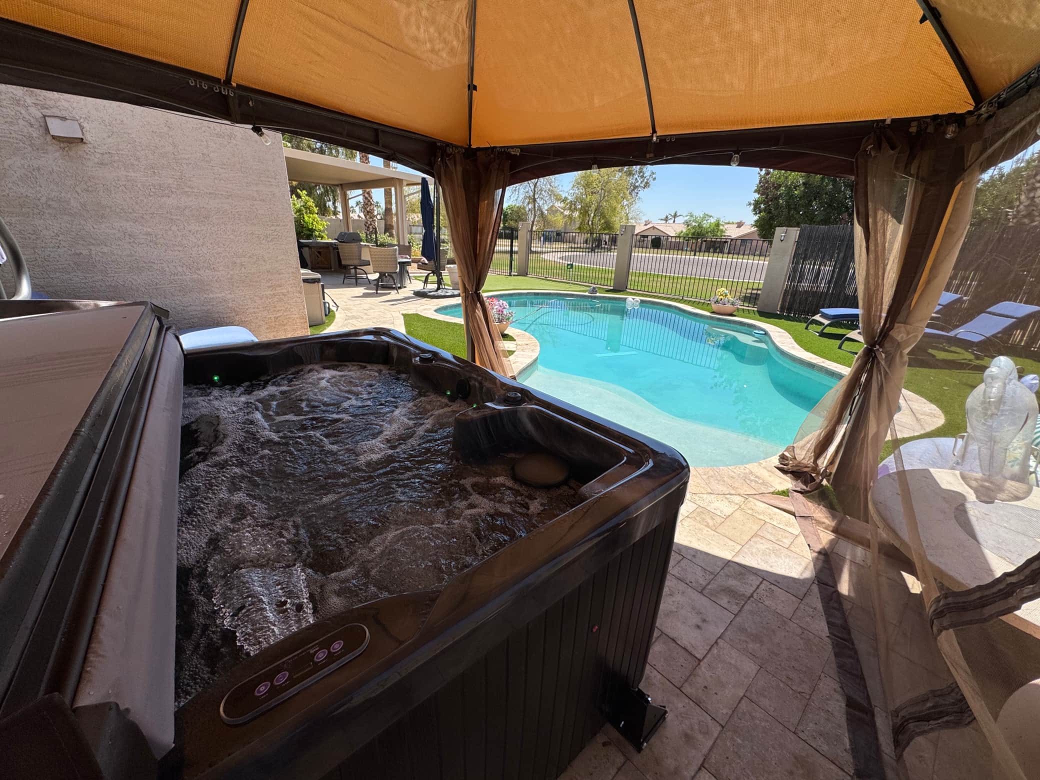 Private courtyard retreat in Peoria featuring a comfortable 1-bedroom suite with pool and hot tub access. Guests enjoy a peaceful residential setting with convenient access to golf courses, spring training stadiums, and scenic desert hiking trails. The beautifully maintained and peaceful courtyard offers a relaxing outdoor space with a gated path to backyard pool, hot tub, cabana, fire pit, lounge areas, and putting green. Ideal for couples and small groups seeking comfort and convenience.